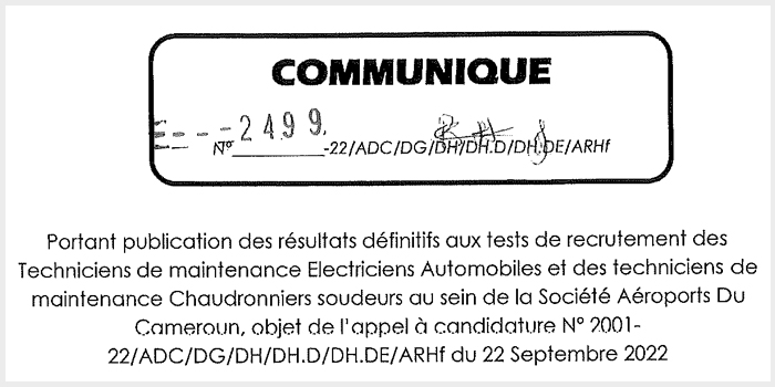 communiqué N° 2499-22/ADC/DG/DH/DH.D/DH.DE/ARHf du 22 Décembre 2022, pourtant publication des résultats définitifs aux tests de recrutement des techniciens de maintenance chaudronniers soudeurs au sein de la société Aéroport Du Cameroun s.a.