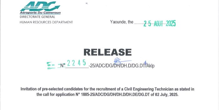 Portant convocation des candidats présélectionnés pour le recrutement d’un Technicien de Génie Civil objet de l’avis d’appel à candidature N° 1885-25/ADC/DG/DH/DH.D/DH.DE/ARHkf du 02 juillet 2025.