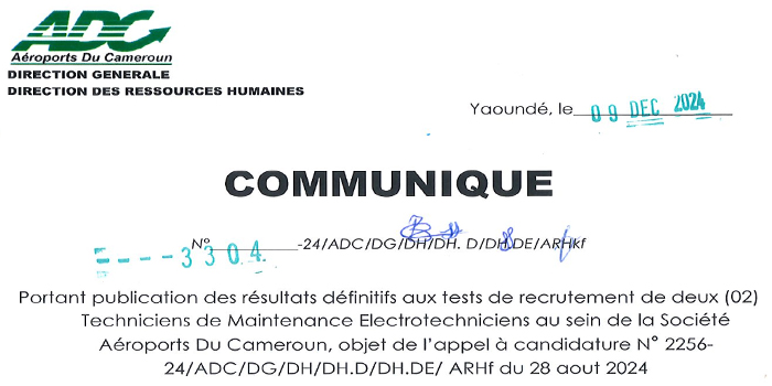 Communiqué N°3304, portant publication des résultats définitifs aux tests de recrutement de 02 techniciens de maintenance au sein de ADC S.A.