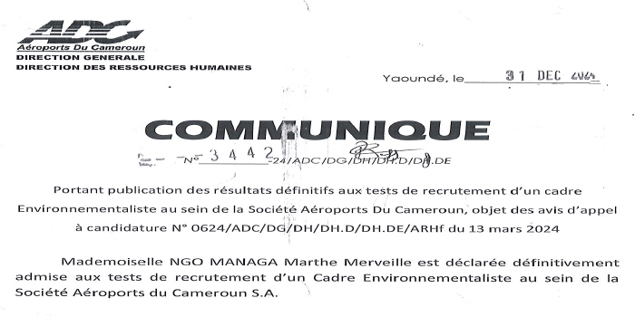 Mademoiselle NGO MANAGA Marthe Merveille est déclarée définitivement admise aux tests de recrutement d'un cadre environnementaliste au sein de la société AEROPORTS DU CAMEROUN.