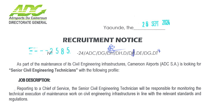 As part of the maintenance of its civil engineering infrastructures, the company Aéroports Du Cameroun is looking for Senior Technicians in Civil Engineering.