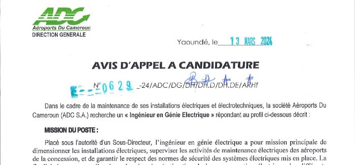 Dans le cadre de la maintenance des ses installations électriques et électroniques, la société Aéroports Du Cameroun (ADC S.A.) recherche un ingénieur en génie électronique.