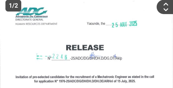 Portant convocation des candidats présélectionnés pour le recrutement d’un Mécatronicien objet de l’avis d’appel à candidature N° 1976-25/ADC/DG/DH/DH.D/DH.DE/ARHnl du 15 juillet.