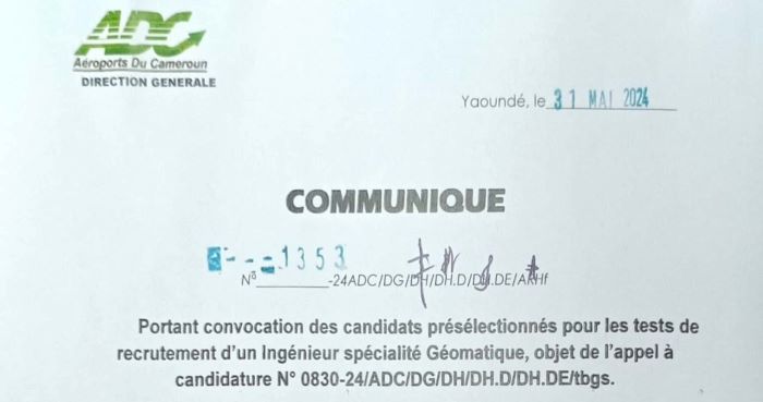 Portant convocation des candidats présélectionnés pour les tests de recrutement d’un Ingénieur spécialité Géomatique, objet de l’appel à candidature N° 0830-24/ADC/DG/DH/DH.D/DH.DE/tbgs.