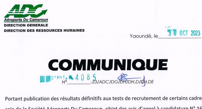Portant publication des résultats définitifs aux tests de recrutement des Techniciens Supérieur en Informatique au sein de la Société Aéroports Du Cameroun, objet de l’appel à candidature N° 1630-23/ADC/DG/DH/DH.D/DH.DE/ARHf du 11 Juillet 2023.