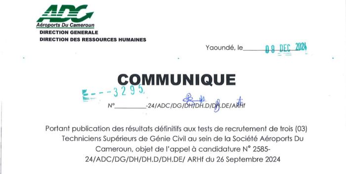 Portant publication des résultats définitifs aux tests de recrutement de trois (03) Techniciens Supérieurs de Génie Civil au sein de la Société Aéroports Du Cameroun, objet de l’appel à candidature N° 2585-24/ADC/DG/DH/DH.D/DH.DE/ ARHf du 26 Septembre 2024