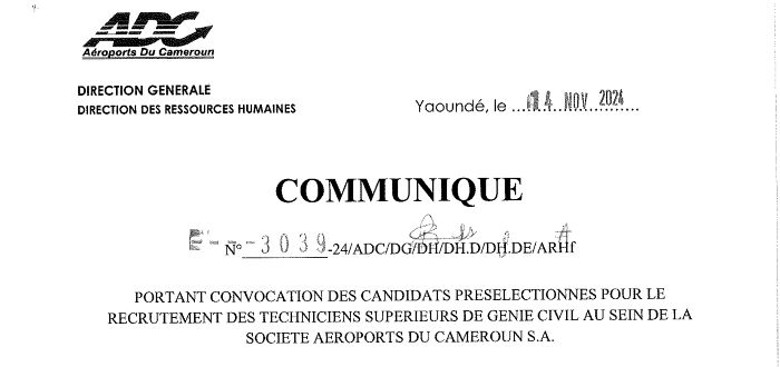 Communiqué portant convocation des candidats pour les tests de recrutement des Techniciens Supérieurs de Génie Civil.