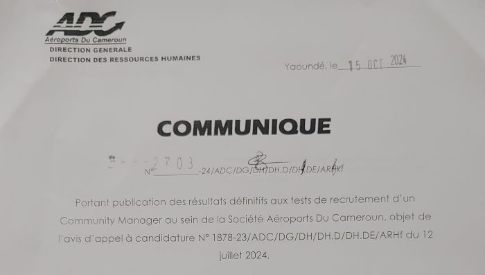 Portant publication des résultats définitifs aux tests de recrutement d’un Community Manager au sein de la Société Aéroports Du Cameroun, objet de l’avis d’appel à candidature N° 1878-23/ADC/DG/DH/DH.D/DH.DE/ARHf du 12 juillet 2024.