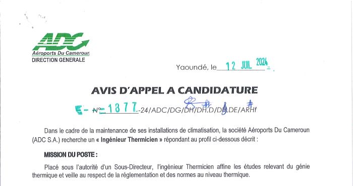 Dans le cadre de la maintenance de ses installations de climatisation, la société Aéroports Du Cameroun recherche un Ingénieur Thermicien.